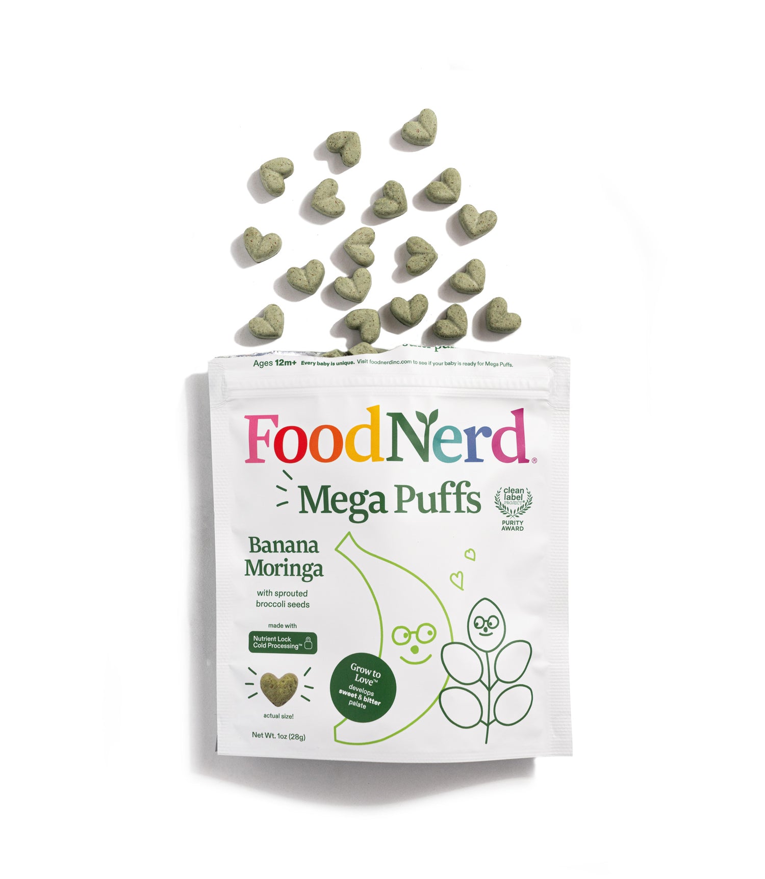 FoodNerd Mega Puffs are nutrient-dense snacks for children, meeting 100% of their daily recommended intake of fruits and vegetables in one pack. Using our unique Nutrient Lock Cold Processing, they are as close to nature as possible, while still being shelf-stable. Unlike traditional puffs, which are often just distractions, Mega Puffs provide real nourishment and peace of mind for parents.