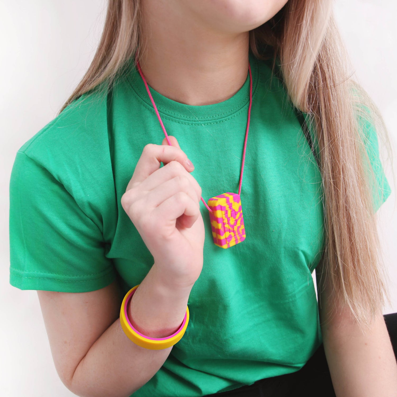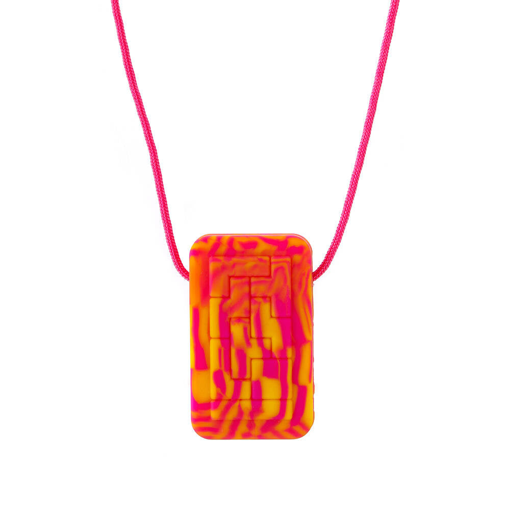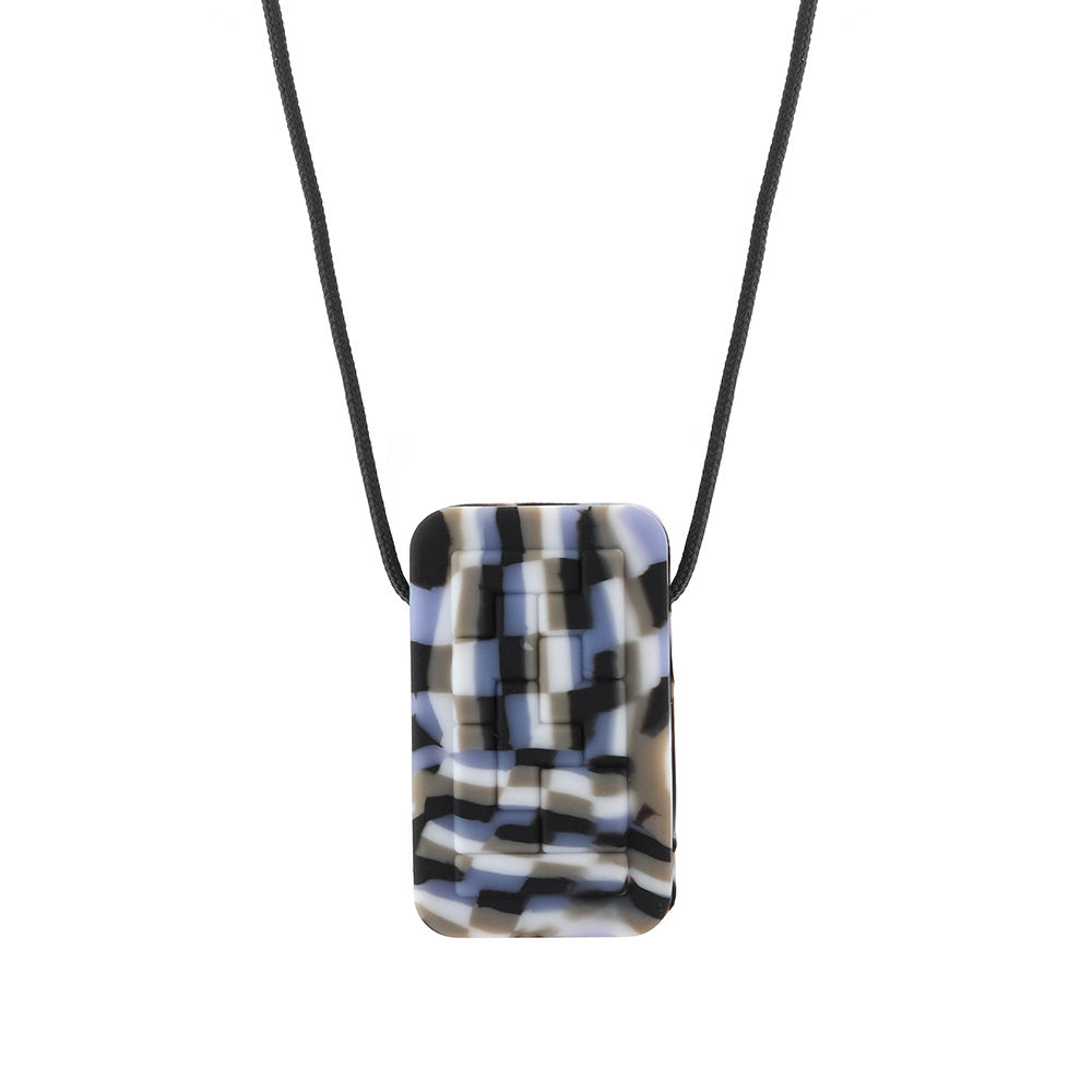 Whether you need to rub your fingers over the texture on the front or squeeze it hard in your fist or chew hard this product provides a cool, contemporary look that combines fun and function resulting in a much-loved pendant.