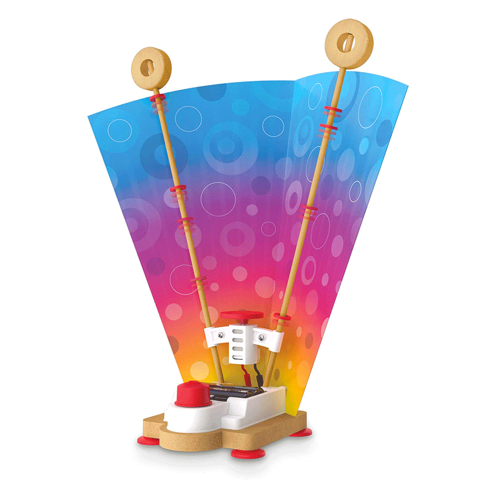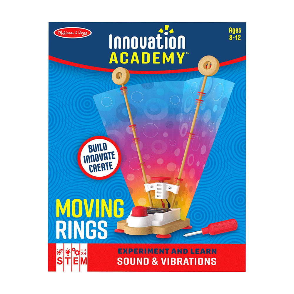 STEM learning made fun! With Innovation Academy's Moving Rings, kids engineer a machine with a vibrating motor that sends rings zooming up and down two poles, while exploring the principles of sound and vibrations! Kids kids practice fine motor skills to building a device that is both visually, and auditory stimulating. Easy-to-follow illustrated instructions help kids eight and older build their project independently. Learn about energy and vibration while building the moving rings machine and activating the motor!