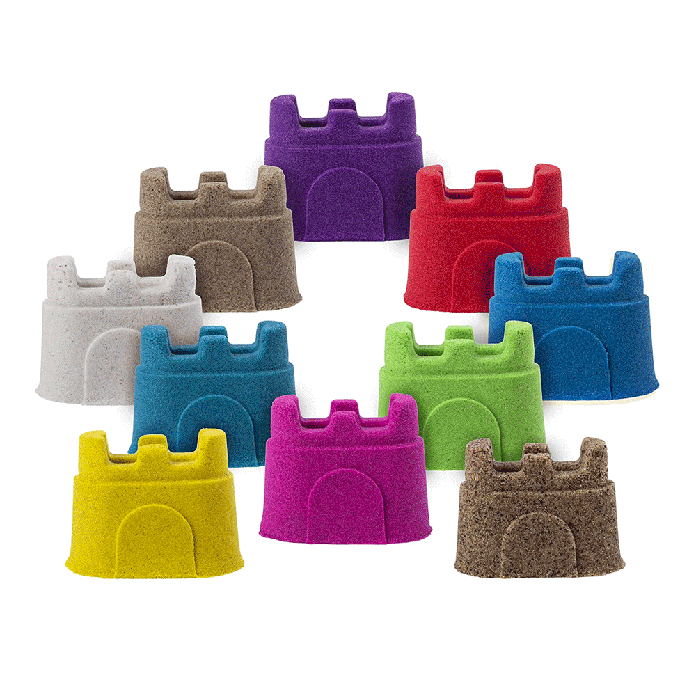 - 10 4.5oz (127g) Vibrantly Colored Kinetic Sand in reusable castle containers that double as molds.