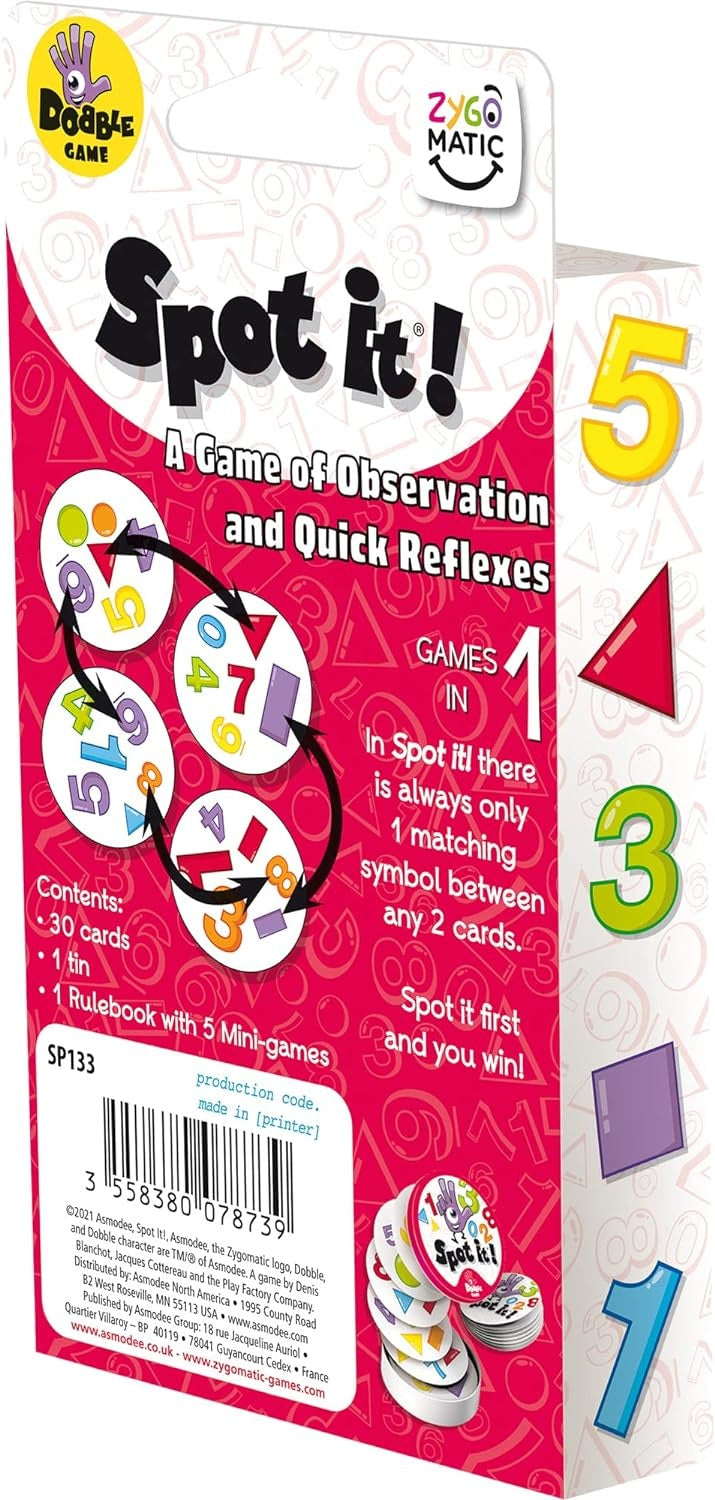 Spot It! 1,2,3 adds an educational twist to the classic Spot It! Game. Perfect for kids aged 3 and up. With vibrant symbols featuring numbers and shapes, it offers fun and engaging gameplay while reinforcing learning.