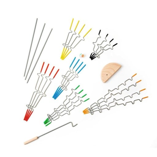 A family game of tricky hangs and steady hands! Try this hanging balance game and you'll be hooked! Suspend comes with 24 notched, rubber-tipped wire pieces to hang from a tabletop stand. Sound easy? Try adding another piece! Each time a bar is added, the balance shifts, the difficulty changes and the incredible midair sculpture transforms. Can you add all your game pieces without making it fall? This tricky game for 1-4 players is a test of steady nerves and steady hands.