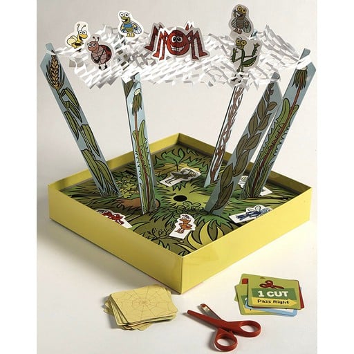 Set up the web and place Willy and the 10 bugs all around it. Pick a card, follow the instructions to cut the web and then pass the scissors to either the left or the right. Work together to cut all the bugs free and you all win! Instructions for play include three different game levels so the fun will grow with your child.