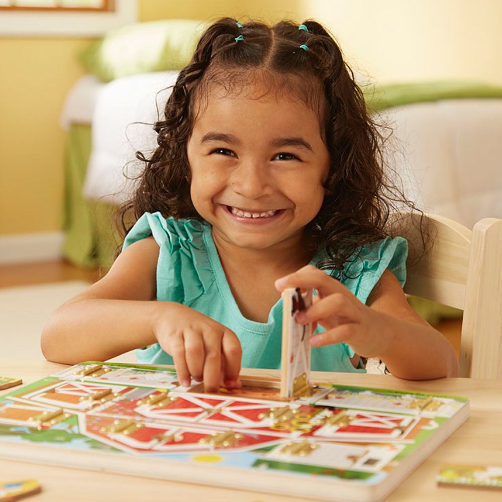 Here a chick, there a chick...behind each of the 9 hinged doors on this charming barnyard scene is a delightful, magnetic animal. Learning about animals while improving memory and fine motor skills will keep children busy and having fun on the farm for hours!